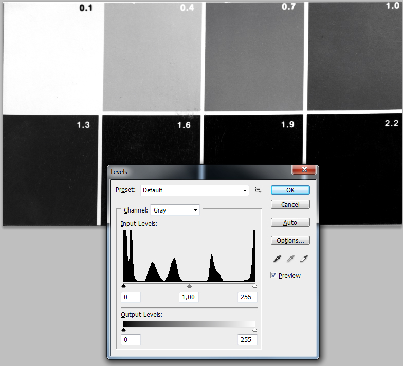 Photoshopin Treshold-toiminnolla voidaan tutkia, mistä sävyarvosta alkaen digikuvaan on alkanut muodostua jotain ja mistä arvosta alkaen kaikki loppu on puhkipalanutta. Kuvallista informaatiota on siis arvojen 47 ja 237 välissä. Pieni tumma viiva 47:n vasemmalla puolella on niin heikko, että tutkittaessa kuvaa siinä ei silmällä näe vielä mustaa missään. Negatiivin todellinen sävyala jää silloin näin lukujen väliin.